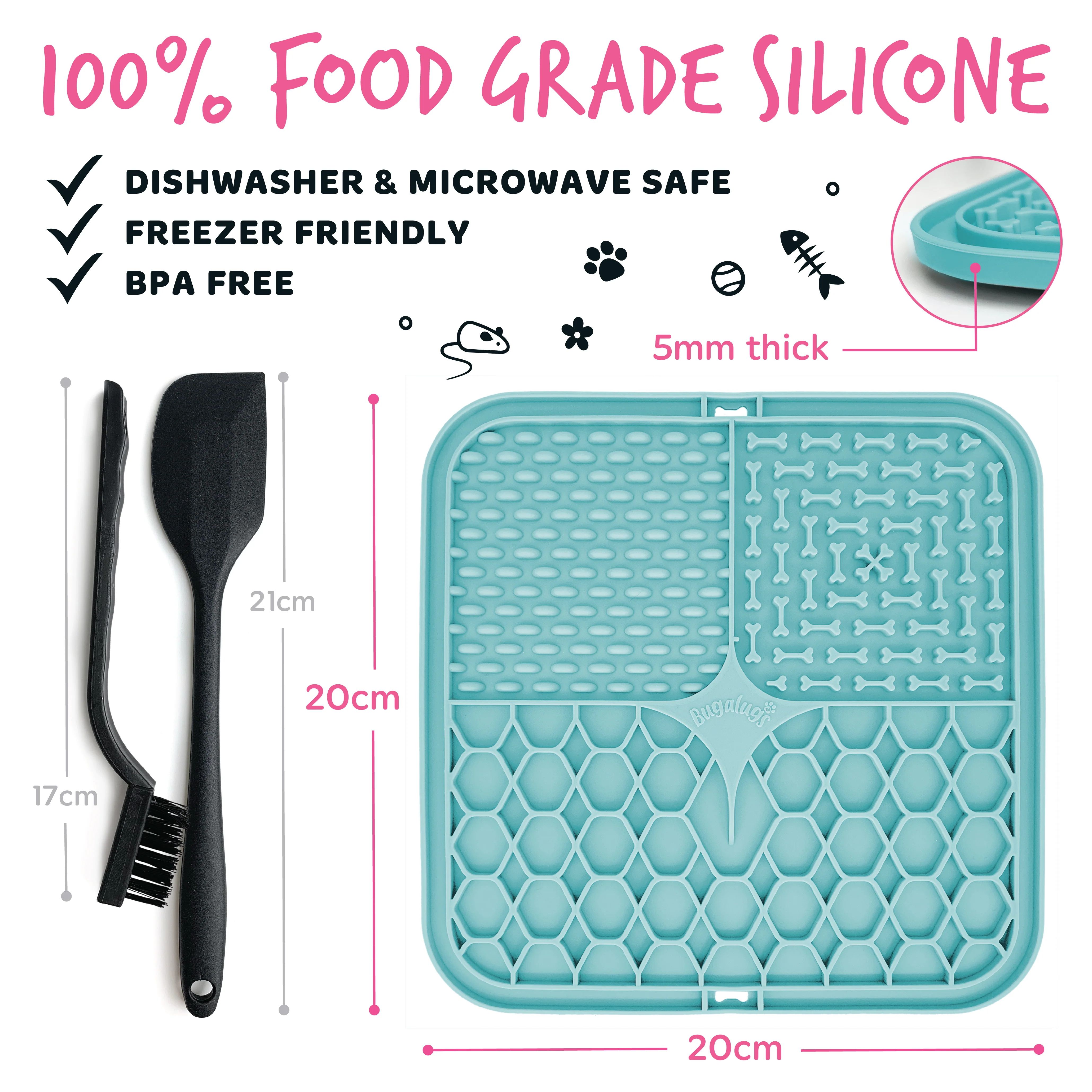 Made from 100% food-grade silicone, the Bugalugs Lick Mat is BPA-free, dishwasher-safe, microwave-safe, and freezer-friendly for easy cleaning and versatility. This twin pack also comes with spatula & brush.